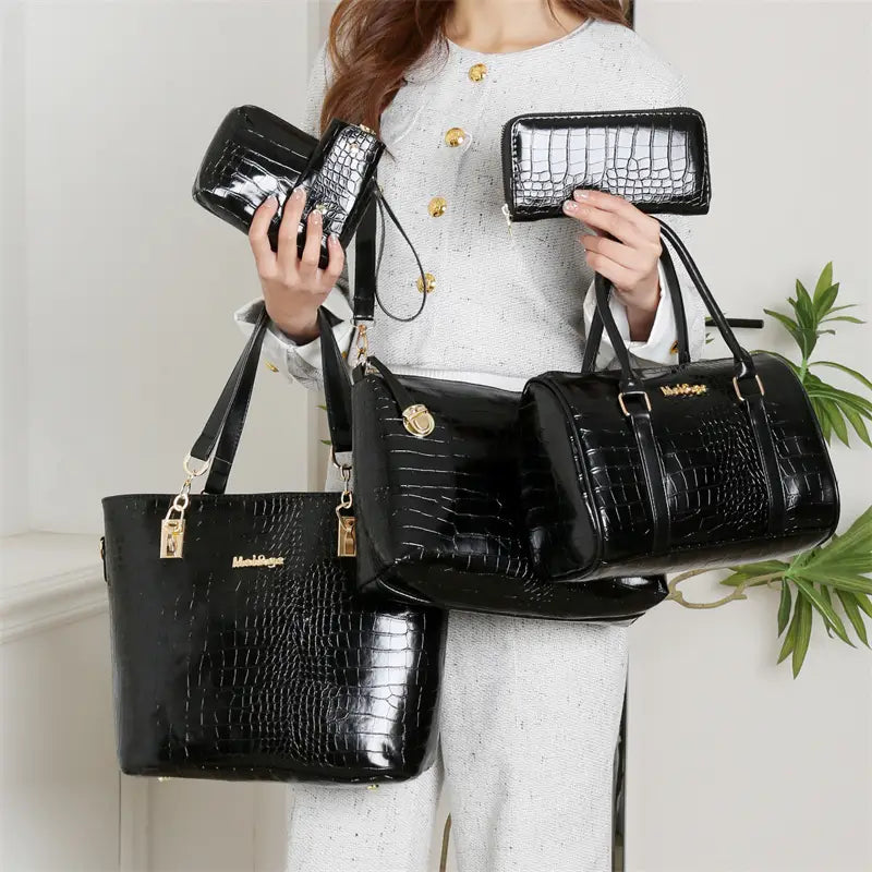Fabricat din material sintetic premium, setul este rezistent, ușor și simplu de întreținut. Cele șase piese incluse oferă versatilitate pentru orice ocazie, incluzând o geantă de umăr, o geantă crossbody, o geantă tote, un portofel, un plic și o mini-poșetă, ideale pentru organizare eficientă.